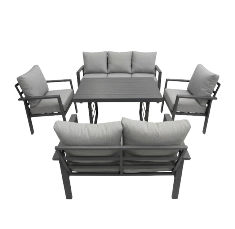 Müasir üslubda dizayn edilmiş bağ və ya terras mebel dəsti əks olunub. Bu tip dəstlər həm estetik görünüşü, həm də dözümlülüyü ilə seçilir. Dəstə 1 ədəd üçnəfərlik divan təximini ölçüsü 200x80x85sm,1 ədəd ikinəfərlik divan təximini ölçüsü 145x80x85sm,2 ədəd təkli kreslo təximini ölçüsü 75x80x85sm,1 ədəd hündür masa təximini ölçüsü 160x90x72sm daxildir.Metal karkas üzərində qurulub. Boz rəngli toz boya ilə rənglənmişdir ki, bu da onu paslanmaya və günəş şüalarına qarşı dözümlü edir.Suya davamlı və asan təmizlənən parçadan hazırlanmış yumşaq oturacaq və kürək yastıqları mövcuddur.Üst səthi metal lövhələrdən ibarətdir, bu da şüşə masalarla müqayisədə daha uzunömürlü və zərbəyə davamlıdır.Bu dəst geniş balkonlar, bağ evlərinin həyətləri, hovuz kənarları və ya açıq hava kafe/restoran terrasları üçün olduqca uyğundur. 7-8 nəfərin eyni anda rahatlıqla əyləşməsi üçün nəzərdə tutulub