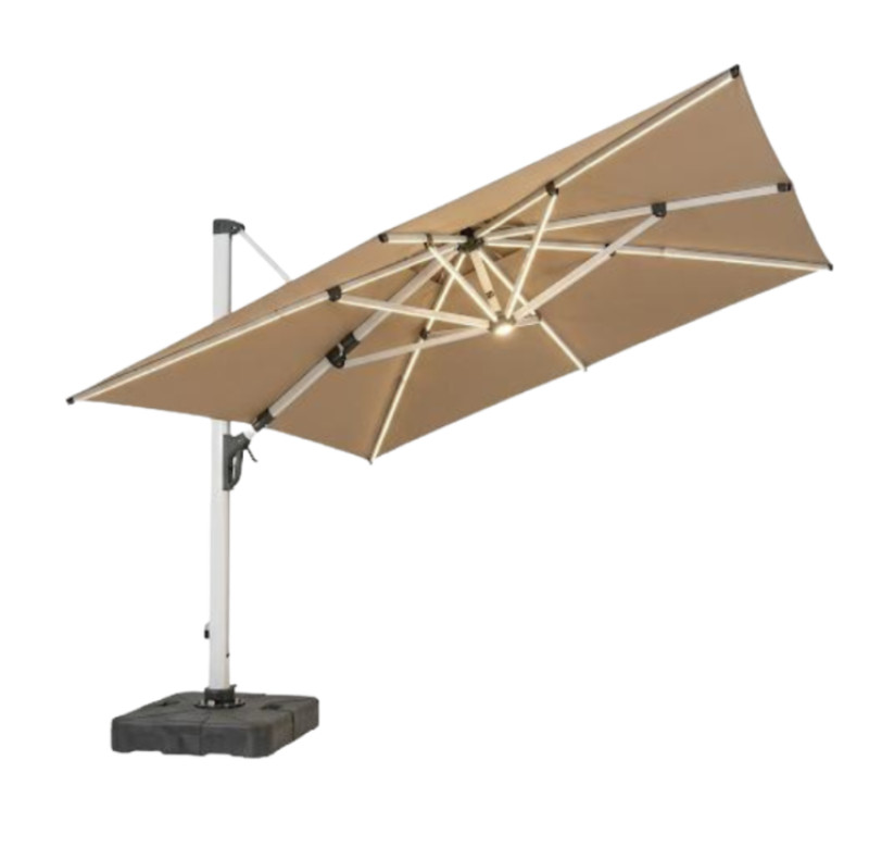 LED İşıqlandırma ilə Eleqant Dizayn olan bu çətir axşam yığıncaqları üçün sehrli bir atmosfer yaradır.Paslanmaya davamlı polad dirək (1,5" / 38 mm diametr) və möhkəmləndirilmiş 5+2+5 polad qabırğa çərçivəsi (ümumi 12 qabırğa) ilə inşa edilmiş bu çətir müstəsna güc və küləyə davamlılıq təklif edir. Davamlılıq üçün nəzərdə tutulmuş, zərif quruluşunu qoruyaraq gündəlik istifadəyə davamlıdır.