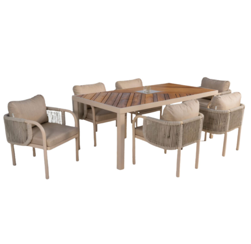 Bu dəst xüsusilə incə toxuma detalları və oval küncləri ilə digər modellərdən daha zərif bir görünüşə sahibdir.Masa çox şık dizayn edilmiş, diaqonal naxışlı təbii ağac lövhələrdən hazırlanıb. Ortada isə estetik və funksional bir detal yerləşdirilib.Karkas paslanmaya davamlı, yüksək keyfiyyətli alüminiumdan ibarətdir.Kresloların həm oturacaq, həm də bel hissəsində yumşaq, su itələyici parça ilə örtülmüş yastıqlar mövcuddur.240 sm-lik masa kifayət qədər böyükdür, ona görə də geniş terraslar, böyük bağ sahələri və ya hovuz kənarı üçün idealdır.İstifadə olunan alüminium və xüsusi kəndir sayəsində mebel illərlə çöl şəraitində qala bilər.Bu dəst böyük ailə şam yeməkləri və ya qonaq qəbul etmək üçün mükəmməl seçimdir.
