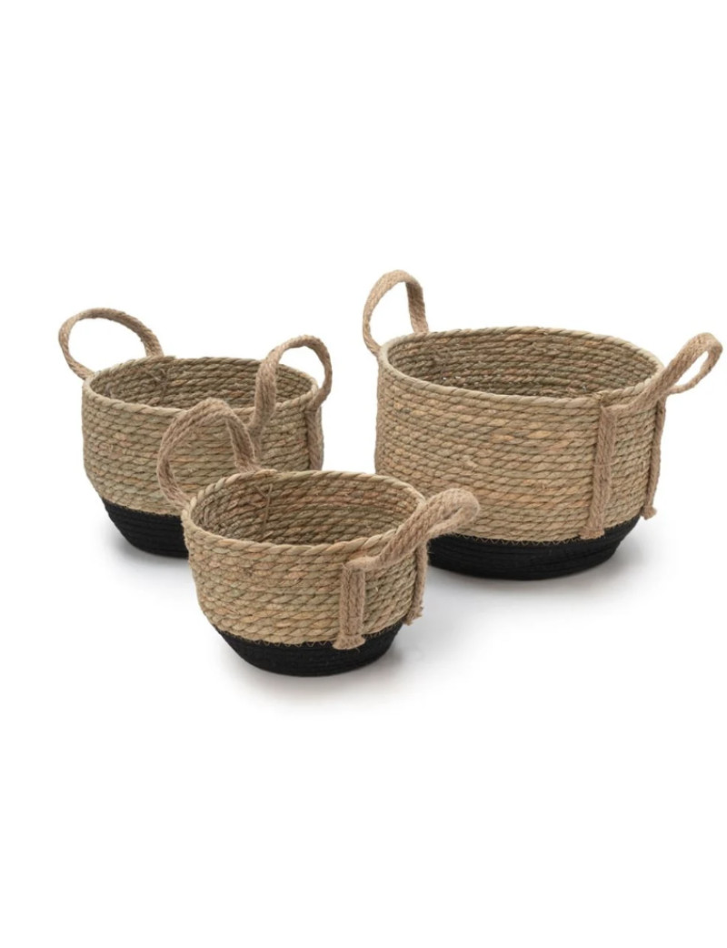 Müxtəlif ölçülərdə olan, təbii materialdan hazırlanmış üçlü saxlama səbəti dəsti, evdə əşyaların təşkili və saxlamaq üçün uyğundur.