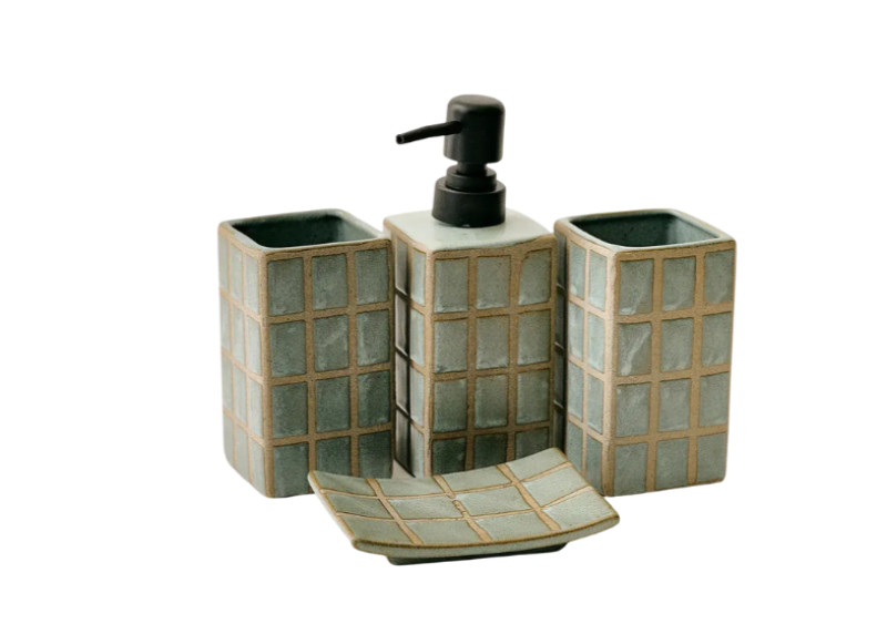 Keramikadan istehsal edilmiş 4 parçalı hamam dəsti. Dəstə maye sabun dispenseru, fincan, sabun qabı, fırça qabı.