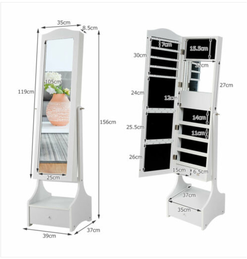 Siyirməli dizayna malik bu şkaf-güzgü həm praktik saxlama yeri, həm də dekorativ element kimi idealdır. Kompakt ölçüləri (37x38.5x157 cm və 35x10x119 cm) sayəsində dar məkanlara asanlıqla yerləşir. Geniş güzgü səthi otağa dərinlik və işıqlıq qatır, siyirmələr isə geyim, aksesuar və şəxsi əşyaların səliqəli saxlanmasına imkan verir. Müasir və funksional seçimdir.