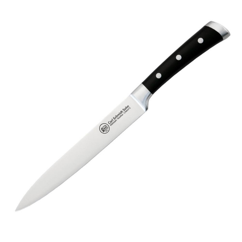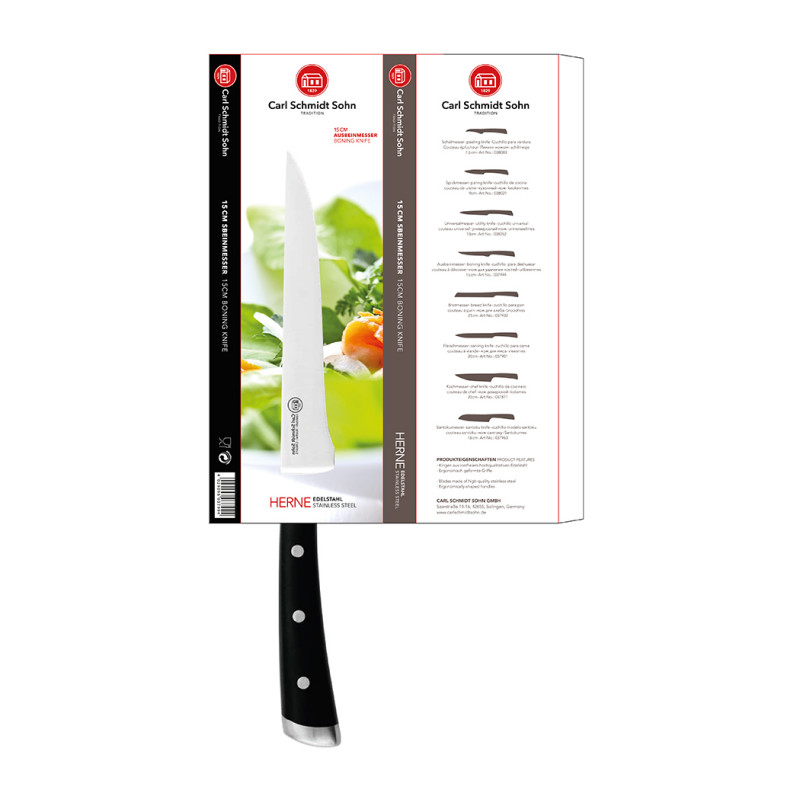 Carl Schmidt Sohns Herne mətbəx bıçaqları yüksək keyfiyyətli paslanmayan poladdan hazırlanır. Gücləndirilmiş, davamlı və şık tutacaqlarla. Rahat tutma üçün hamar və bir qədər yuvarlaqlaşdırılmış erqonomik qara pərçim tutacağı ilə təchiz edilmişdir. Tutacaqlar mükəmməl tutuş üçün erqonomik formadadır. Əl itiləmə və əl yuma tövsiyə olunur.