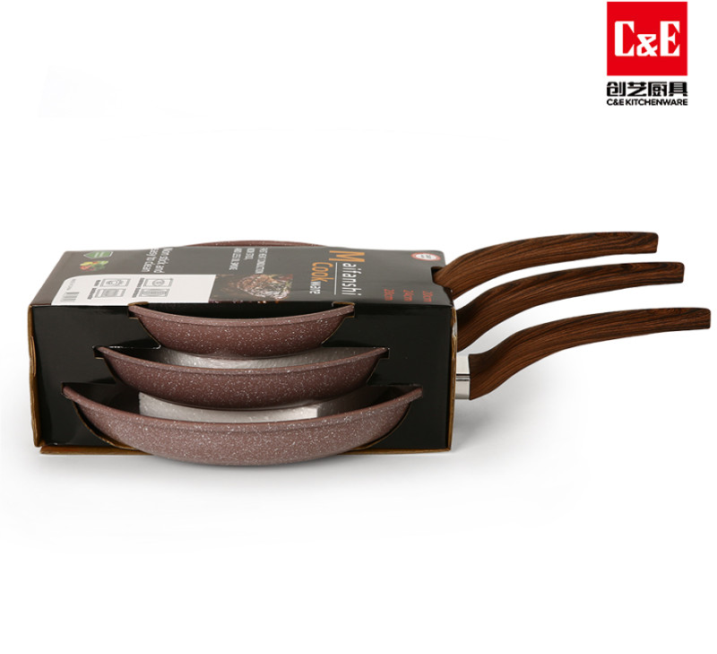 Yüksək keyfiyyətli yapışmayan örtüklü 3-lü tava dəsti. Qranit görünümlü səthi sayəsində yeməklər yapışmır və asan təmizlənir. İstiyə davamlı taxta dizaynlı tutacaqlar rahat istifadə imkanı yaradır. Qaz, elektrik və keramika ocaqlarda istifadəyə uyğundur.