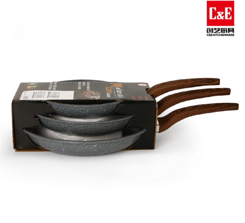 Yüksək keyfiyyətli yapışmayan örtüklü 3-lü tava dəsti. Qranit görünümlü səthi sayəsində yeməklər yapışmır və asan təmizlənir. İstiyə davamlı taxta dizaynlı tutacaqlar rahat istifadə imkanı yaradır. Qaz, elektrik və keramika ocaqlarda istifadəyə uyğundur.