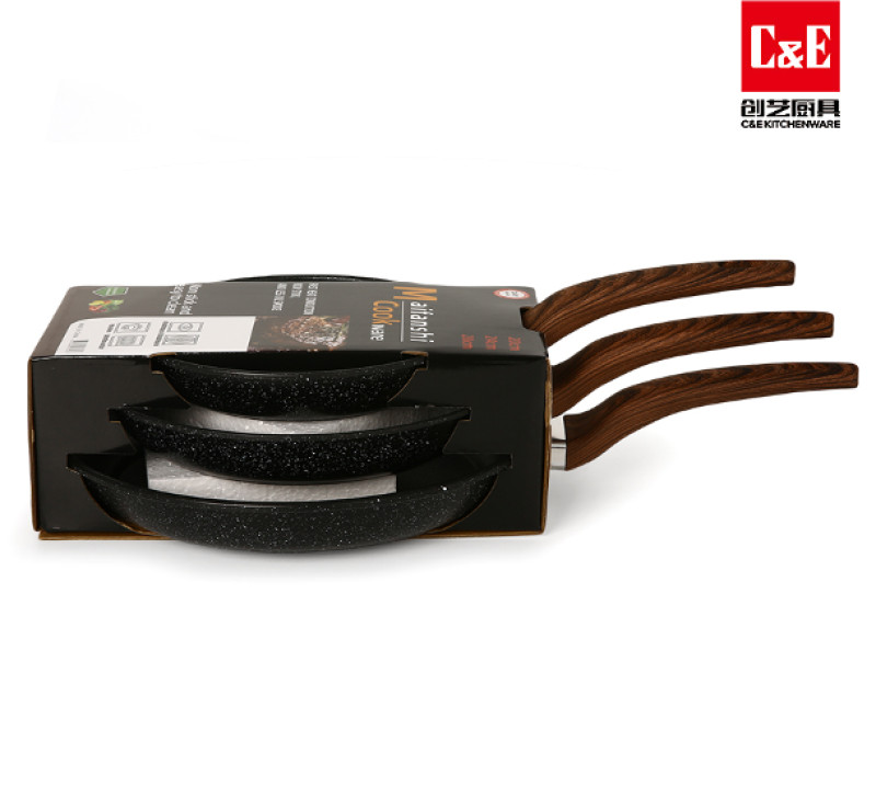 Mətbəx üçün ideal 3-lü tava dəsti — 22 sm, 26 sm və 30 sm ölçülərdə. Qranit örtüklü səthi sayəsində yeməklər yapışmadan bişir və təmizlənməsi çox asandır. Taxta görünümlü rahat sapı istiliyə davamlıdır. Hər növ ocaqda istifadəyə uyğundur.