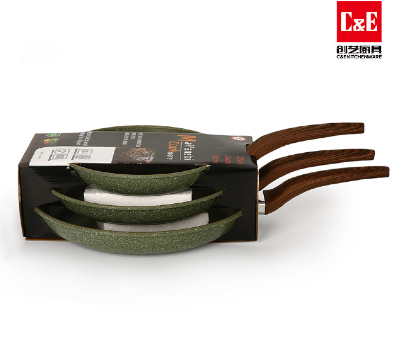 Mətbəx üçün ideal 3-lü tava dəsti — 22 sm, 26 sm və 30 sm ölçülərdə. Qranit örtüklü səthi sayəsində yeməklər yapışmadan bişir və təmizlənməsi çox asandır. Taxta görünümlü rahat sapı istiliyə davamlıdır. Hər növ ocaqda istifadəyə uyğundur.