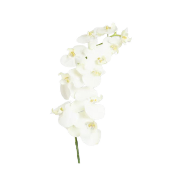 Təbii görünüşlü, baxım tələb etməyən, dekorativ məqsədlər üçün uyğun ağ falenopsis formalı süni güldür.