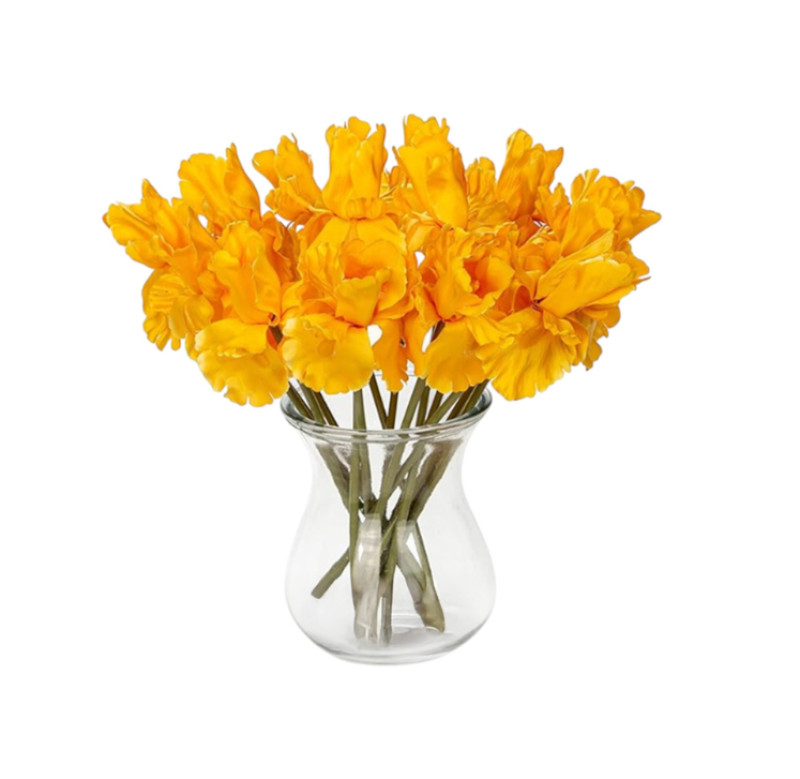 Təbii görünüşlü, baxım tələb etməyən, dekorativ məqsədlər üçün uyğun sarı iris formalı süni güldür.