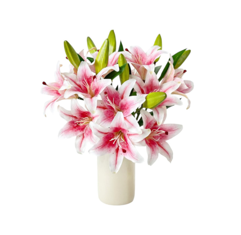 Təbii görünüşlü, baxım tələb etməyən, dekorativ məqsədlər üçün uyğun çəhrayı liliya formalı süni güldür.