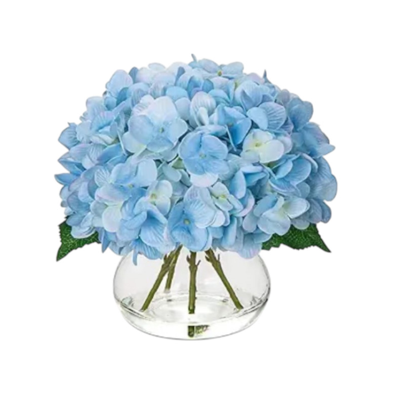 Təbii görünüşlü, baxım tələb etməyən, dekorativ məqsədlər üçün uyğun açıq mavi qortenziya formalı süni güldür.