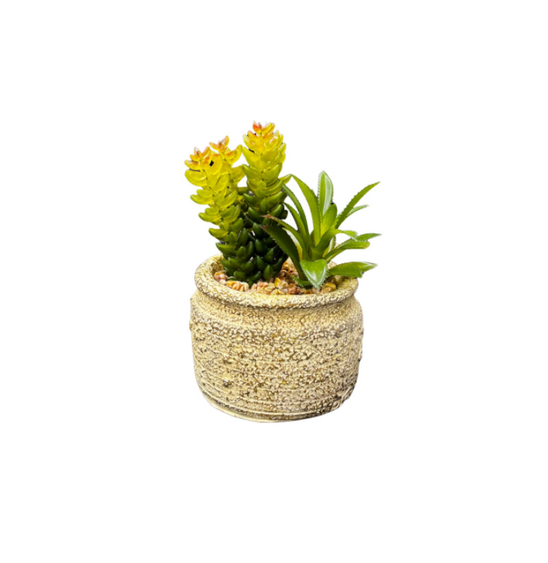 Süni gül sukkulent dibçəkdə – təbii bitki görünüşünü imitasiya edən, baxım tələb etməyən dekorativ aksessuardır. Yüksək keyfiyyətli materialdan hazırlanıb və müxtəlif interyerlərdə — ofis, ev və ya kafe məkanlarında — təbiilik və təravət hissi yaradır. Dibçək içərisindəki süni sukkulent uzunömürlüdür və günəş işığına ehtiyac duymadan estetik görünüşünü qoruyur.
